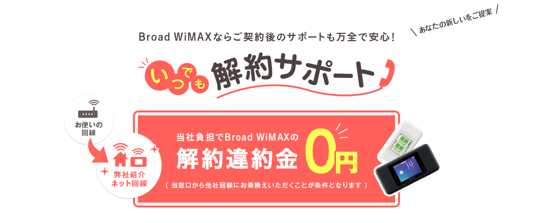 当窓口から他インターネットへお乗換えの場合は、Broad WiMAXの違約金はいただきません!