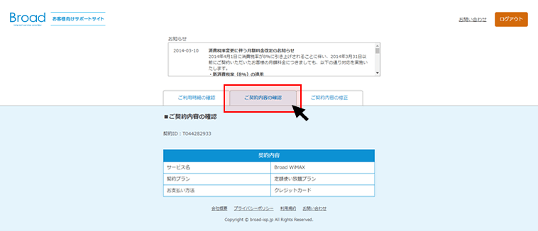 お客様ページの「ご契約内容の確認」をクリックしてください。