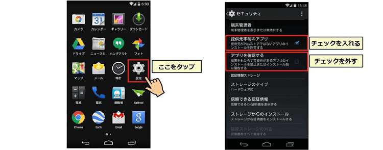 ホーム画面またはアプリ一覧の「設定」アプリのアイコンをタップし、「提供元アプリ」にチェックを入れるとき、確認ダイアログが表示されるので「OK」をタップしてください。