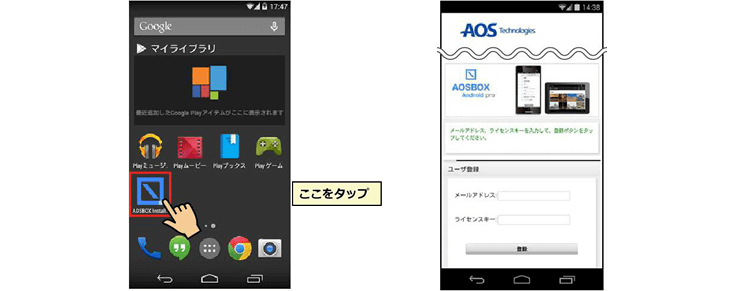 続いて下記のユーザー登録とAOSBOX Android Proのインストールはユーザー自身が行うことになります。