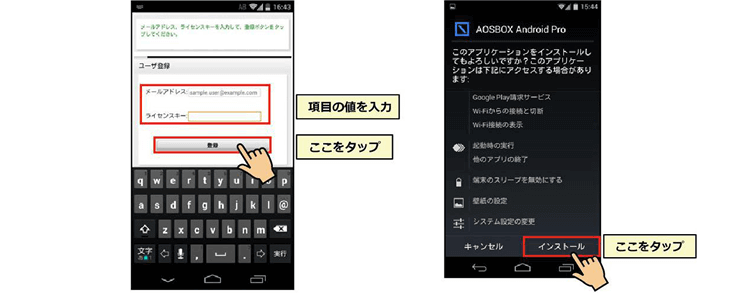 ユーザー(アプリ利用者)のメールアドレスとライセンスキーを入力して「登録ボタン」をタップすると、AOSBOX Android Pro のインストール確認画面が表示されるので、「インストール」をタップします。