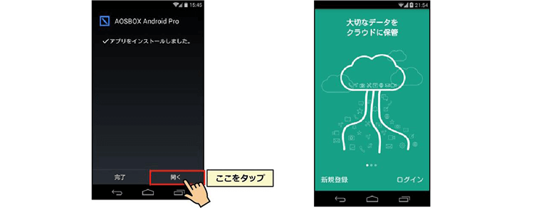AOSBOX Android Pro のインストールが完了し、「開く」ボタンをタップするとAOSBOXアプリが起動します。アプリの利用を開始するには、新規アカウントの登録と初期設定を行う必要があります。