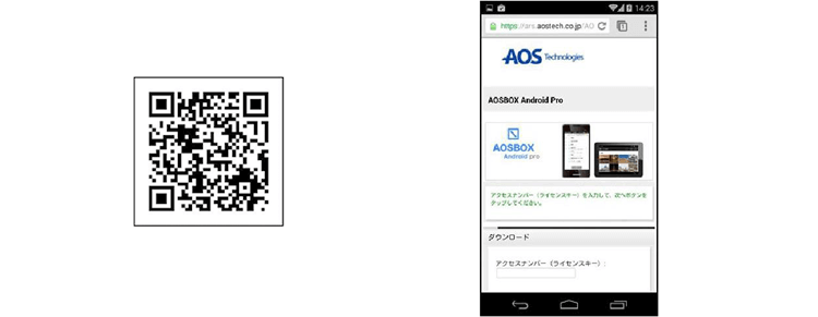 QRコードリーダーアプリを起動し、QRコードを読み込むとAOSBOXアプリのダウンロード&起動画面が表示されます。