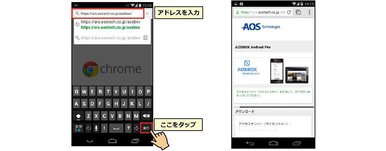 ブラウザアプリを起動して、アドレス(URL)入力欄に下記のAOSBOXダウンロード&起動画面のアドレスを入力して「実行」ボタンをタップすると、最初の画面(アクセスナンバー入力画面)が表示されます。