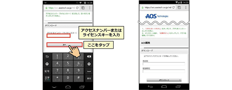 AOSBOXダウンロード&起動画面のアクセスナンバー(ライセンスキー)入力欄に、アクセスナンバーまたはライセンスキーを入力し「次へ」ボタンをタップすると、ダウンロード画面が表示されます。