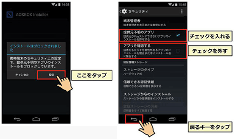 「提供元不明アプリ」にチェックを入れるとき、確認ダイアログが表示されるので「OK」をタップし、前の画面に戻るため「戻る」キーをタップします。