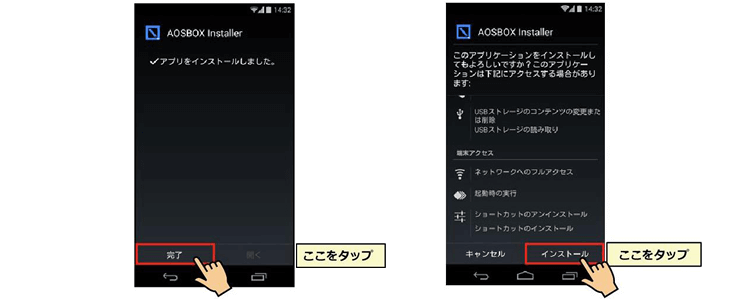 インストール完了画面の「完了」ボタンをタップすると、AOSBOXインストーラーアプリの確認画面が表示されるので「インストールボタン」をタップします。