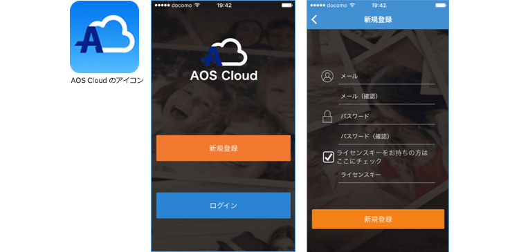 AOS Cloud のアイコンをタップし、アプリを起動させます。「新規登録」をタップし、メールアドレス、パスワード、ライセンスキーを入力し「新規登録」ボタンをタップします。