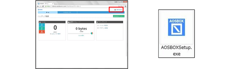 「バックアップの概要」ページが開きますので、画面右上の「AOSBOXをダウンロード」をクリックし、ダウンロードした「AOSBOXSetup.exe」をダブルクリックしてください。