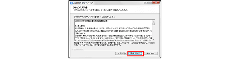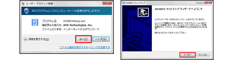「ユーザーアカウント制御」ダイアログが表示されることがありますが「はい(Y)」をクリックしてください。「AOSBOXセットアップ」ダイアログが表示されるので「次へ(Y)」をくりっくしてください。