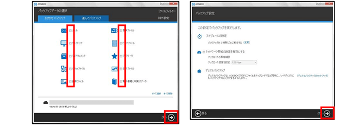 バックアップデータの選択画面が表示されるので、対象のカテゴリーにチェックし、「次へ」をクリックしてください。バックアップ設定画面が表示されるので、「次へ」をクリックしてください。