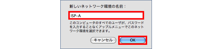 4【新しいネットワーク環境の名前】に、ご契約プロバイダの名称など、任意のわかりやすい名前を入力してください。終わりましたら、【OK】をクリックしてください。