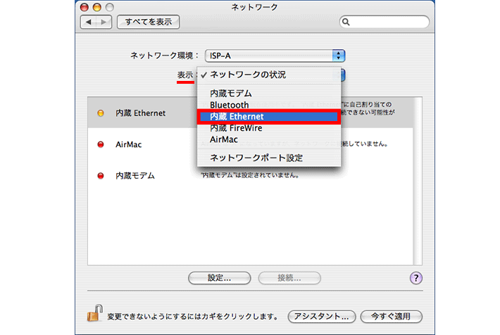 5「表示」のプルダウンメニューから【内蔵Ethernet】を選択してください。