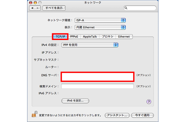 8DNSサーバーアドレスを指定するインターネットサービスプロバイダを ご利用の場合は、【TCP/IP】タブをクリックし【DNSサーバ】欄に指定された DNSサーバーのIPアドレスを入力してください。