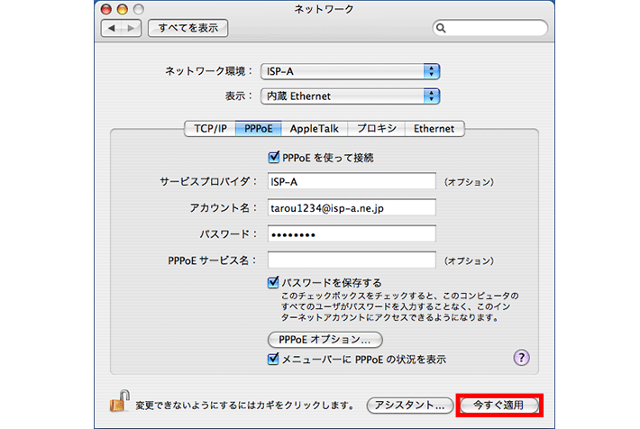 | パスワード | インターネットサービスプロバイダに登録されているパスワードを入力してください。 (例) password |