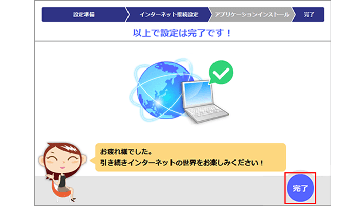 Web ブラウザを起動して、インターネット接続をお試しください。 Webページの閲覧が可能であれば、インターネットへ接続されています。broad光西日本で簡単セットアップツールを用いた接続設定方法は以上です。