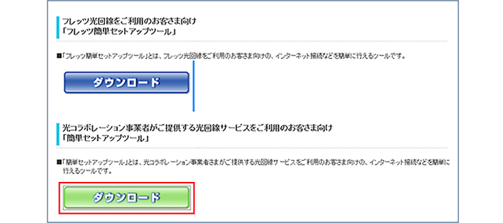 ※ ダウンロード用ページに遷移しない、または簡単セットアップツールをダウンロードできない場合は、こちらから手動で設定をおこなってください。