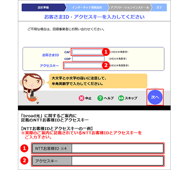 ※ お客さまID とアクセスキーがご不明な場合は「スキップ」を選択してください。