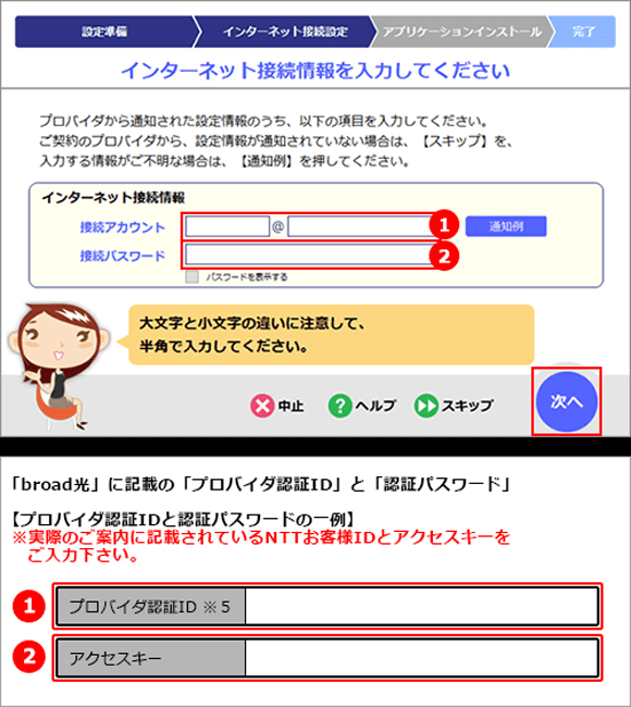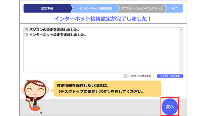 「接続アカウント」と「接続パスワード」に、「ご契約内容確認書」に記載の「プロバイダ認証ID」と「認証パスワード」を入力し、「次へ」を選択してください。