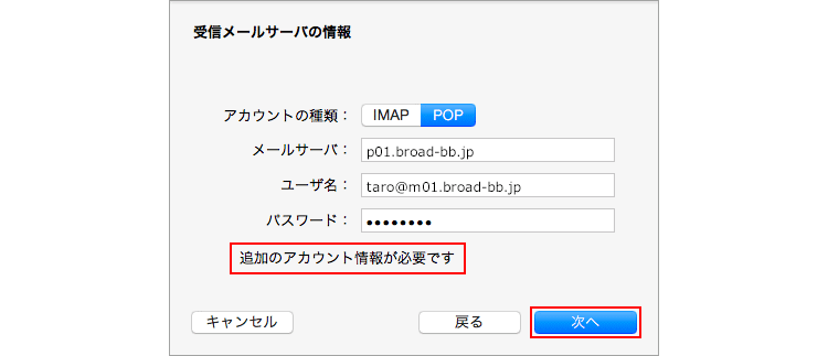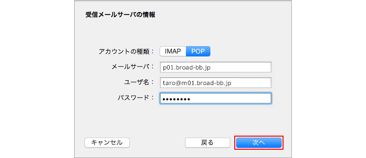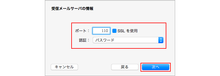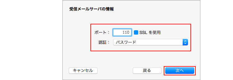 5「受信メールサーバの情報」の画面で、以下のように設定し、「次へ」を選択します