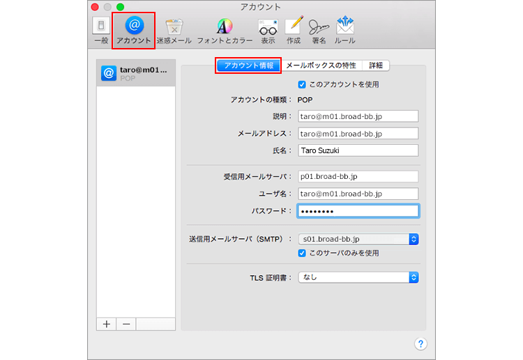8「アカウント」ボタンを選択し、「アカウント情報」タブを選択して、以下のように設定されていることを確認します