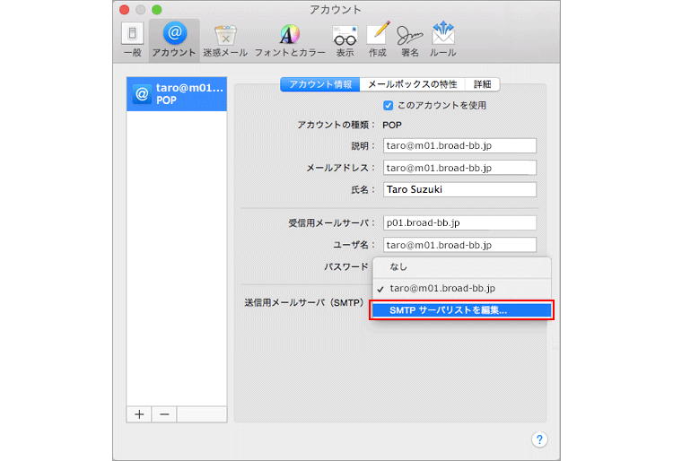 9「送信用メールサーバ (SMTP)」欄から、「SMTP サーバリストを編集...」を選択します