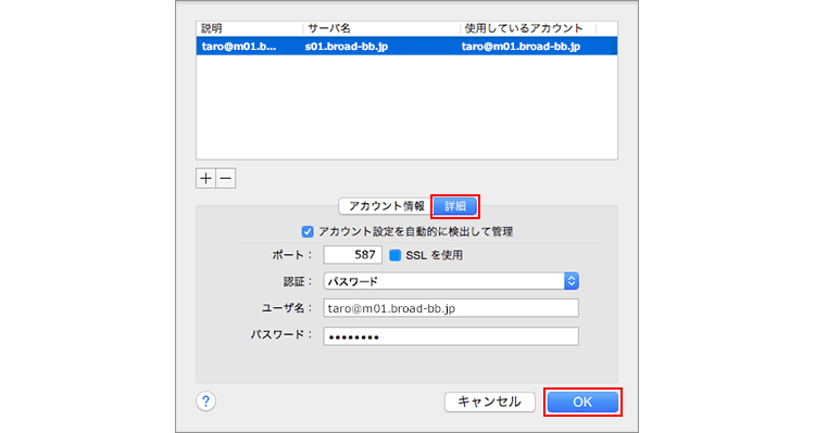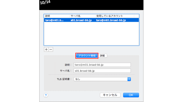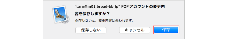 13「”taro@m01.broad-bb.jp”POP アカウントの変更内容を保存しますか?」の画面が表示されましたら、「保存」を選択します