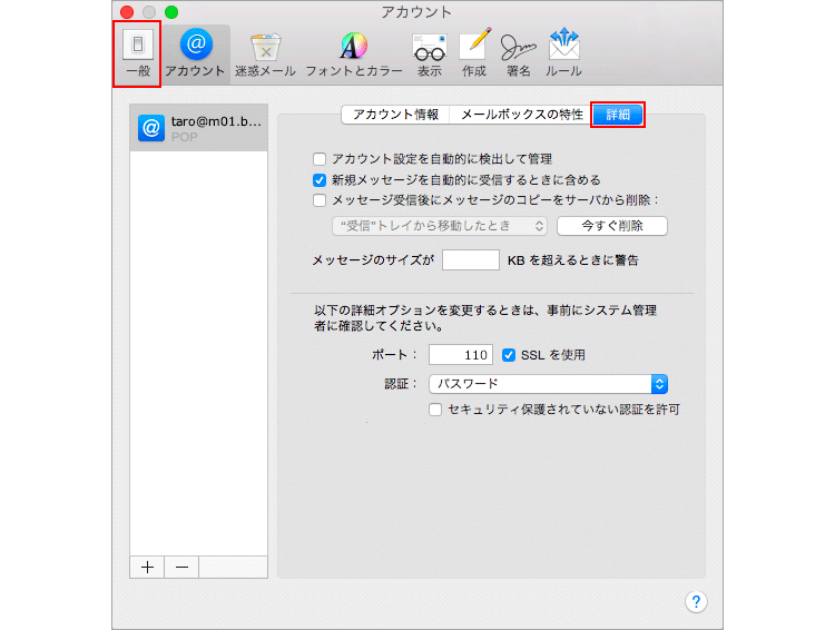 12「アカウント」の画面に戻りましたら、「詳細」タブを選択して以下のように設定し、画面左上の「一般」を選択します