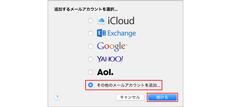 2「追加するメールアカウントを選択...」の画面が表示されましたら、「その他のメールアカウントを追加...」を選択し、「続ける」を選択します