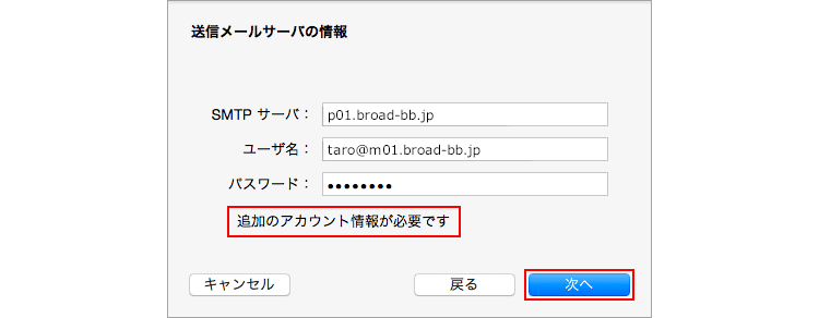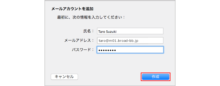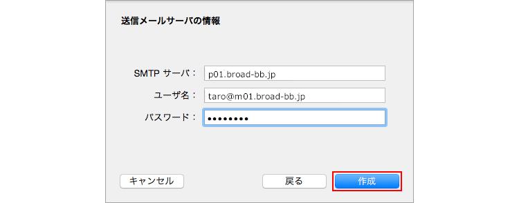 6「送信メールサーバの情報」の画面で、以下のように設定し、「作成」を選択します