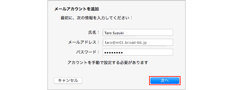 4「アカウントを手動で設定する必要があります」のメッセージが表示されたら、「次へ」を選択します