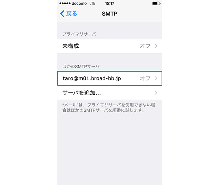 「SMTP」の画面で、「taro@m01.broad-bb.jp」を選択します。