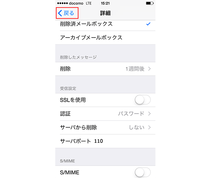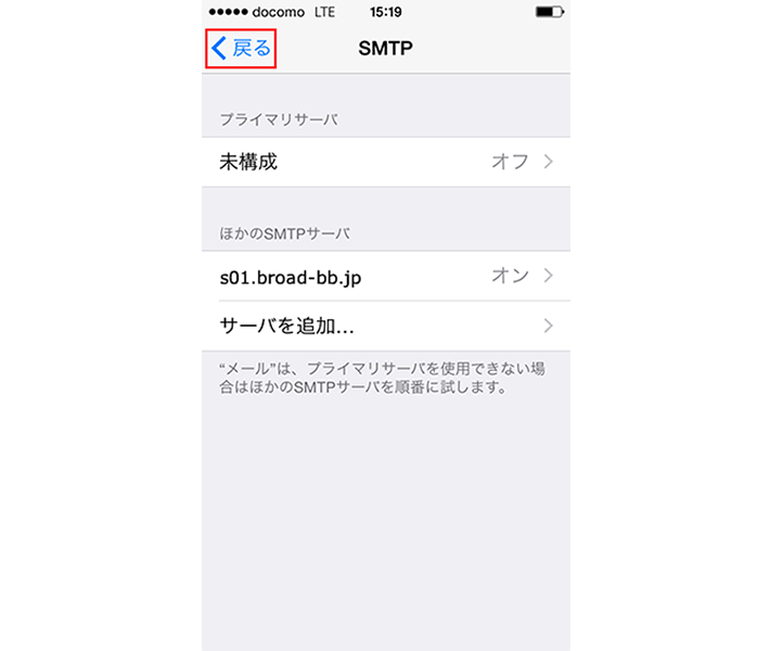 「SMTP」の画面で、「戻る」を選択します。