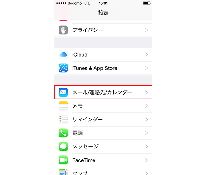「設定」の画面で、「メール/連絡先/カレンダー」を選択します。