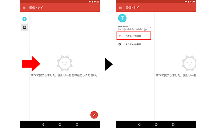 受信トレイが表示された場合は左メニューを右へスワイプし、表示されたメニューから「アカウントを追加」を選択します。