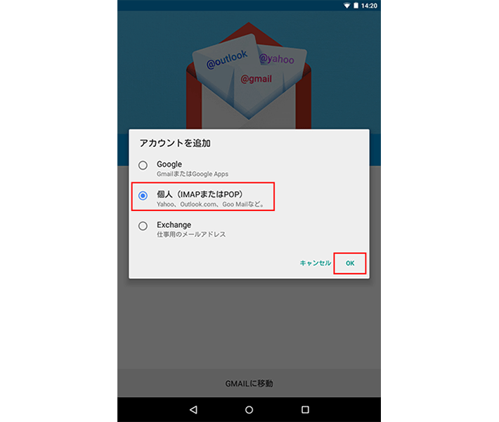 「アカウントを追加」の画面で、「個人 (IMAPまたはPOP)」を選択し、「OK」を選択します。