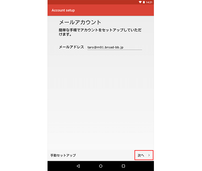・「メールアドレス」: [メールアドレス] を入力します 例) taro@m01.broad-bb.jp