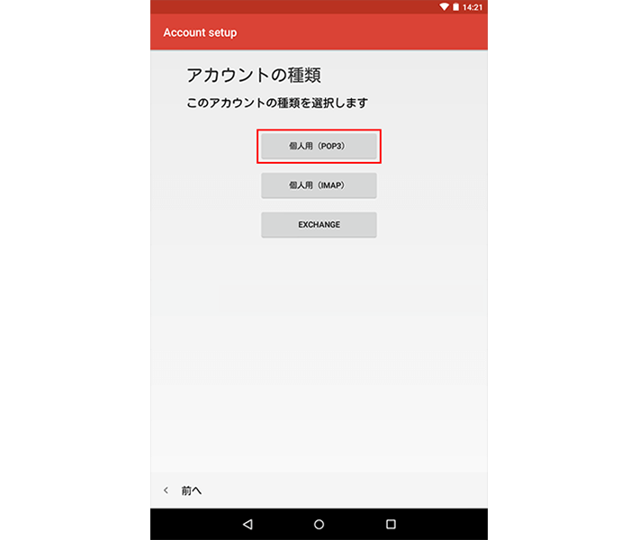 「アカウントの種類」の画面で、「個人用 (POP3)」を選択します。