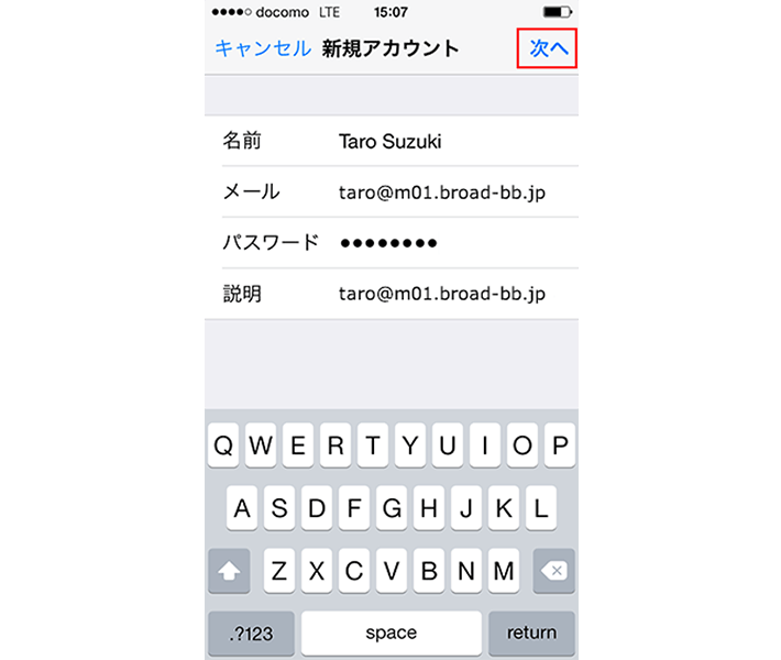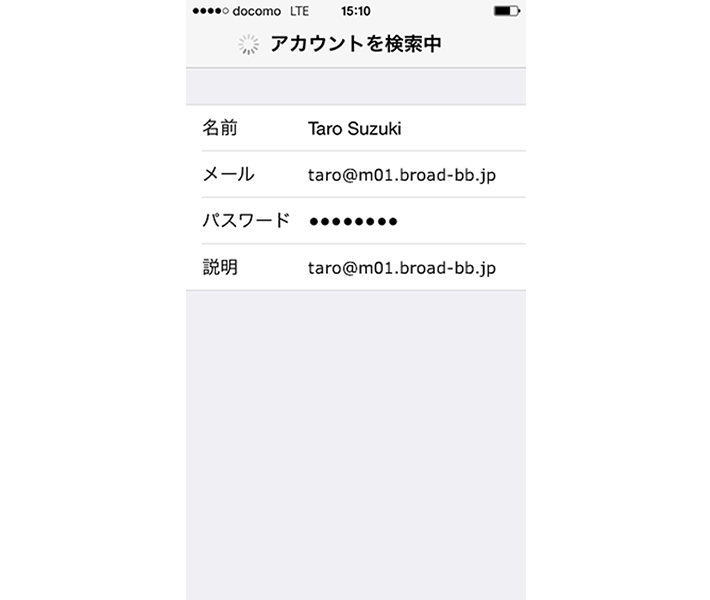 ・「メール」: [メールアドレス] を入力します 例) taro@m01.broad-bb.jp