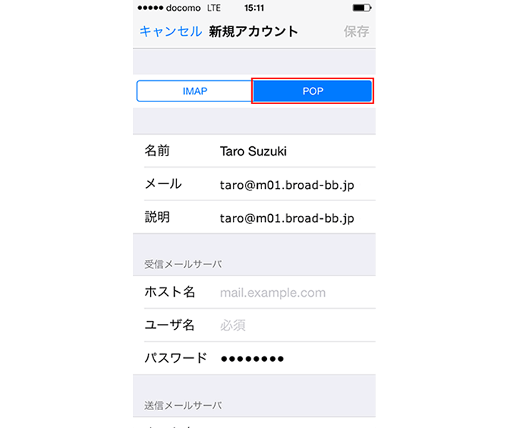 「新規アカウント」の画面で「POP」を選択します。