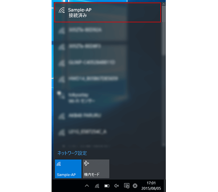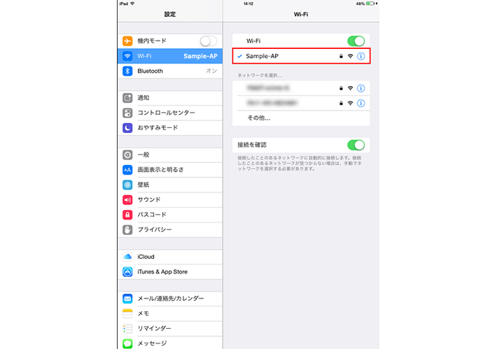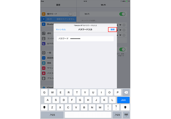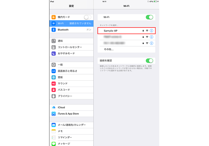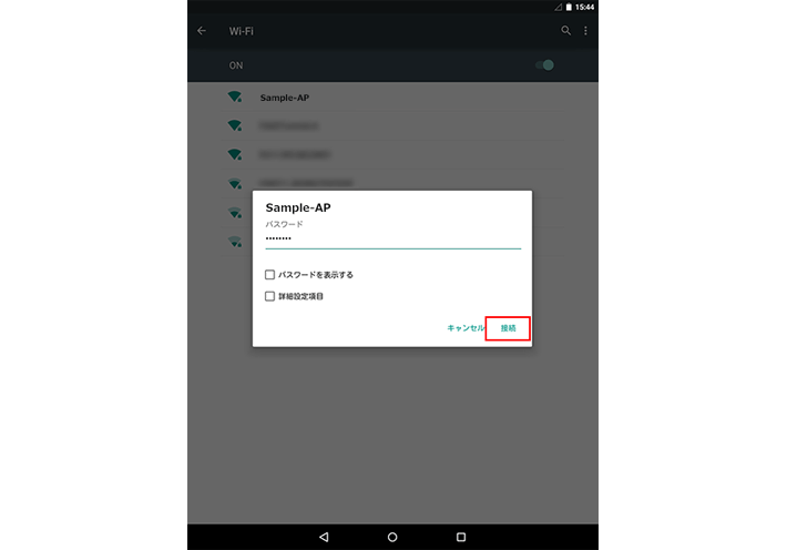 誤ったパスワードを入力してしまった場合、再度該当の SSID (ここでは「Sample-AP」) を長押し、またはタップしてください。