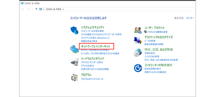 「コントロール パネル」の画面で、「ネットワークとインターネット」を選択します。