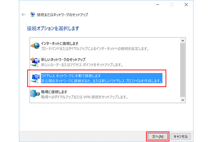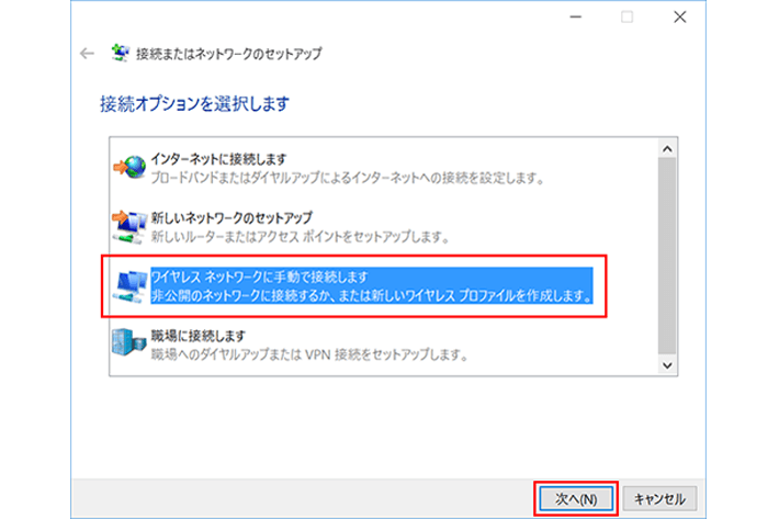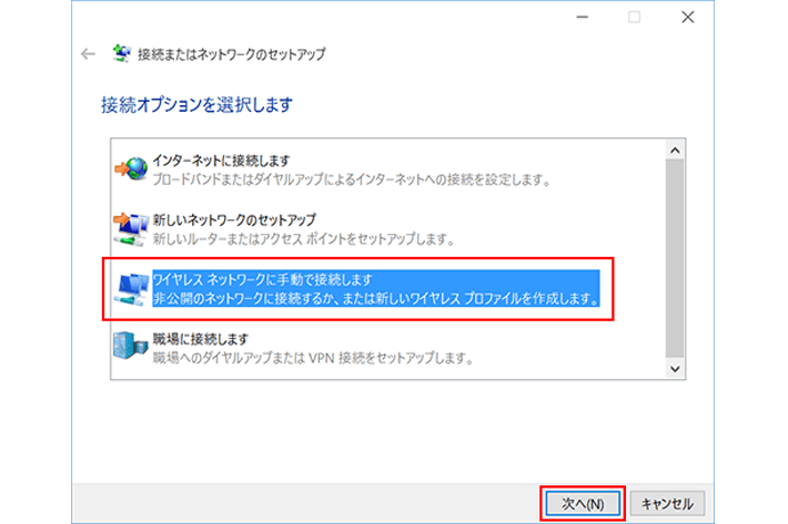 「接続またはネットワークのセットアップ」の画面で、「ワイヤレスネット ワークに手動で接続します」を選択して「次へ(N)」を選択します。