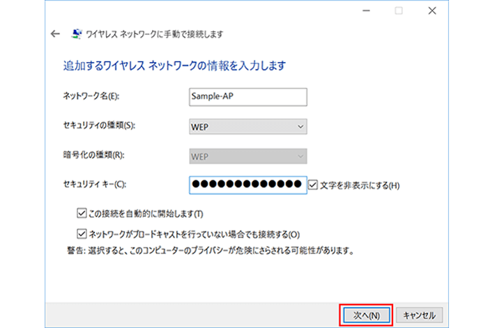「ネットワーク セキュリティ キーの入力」の画面で、以下のように設定します。