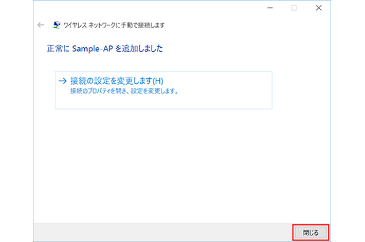 「正常に [SSID] を追加しました」と表示されましたら、「閉じる」を選択します。