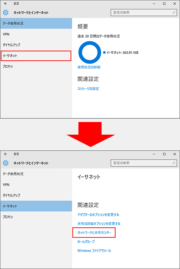 左メニューより「イーサネット」を選択し、「ネットワークと共有センター」を選択してください。