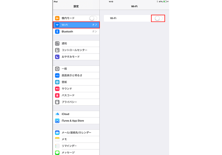 「Wi-Fi」の画面で、Wi-Fi を ON にし、利用する親機の [SSID] を選択します。