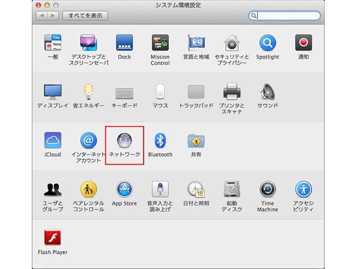 「システム環境設定」の画面で、「ネットワーク」を選択します。