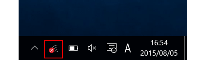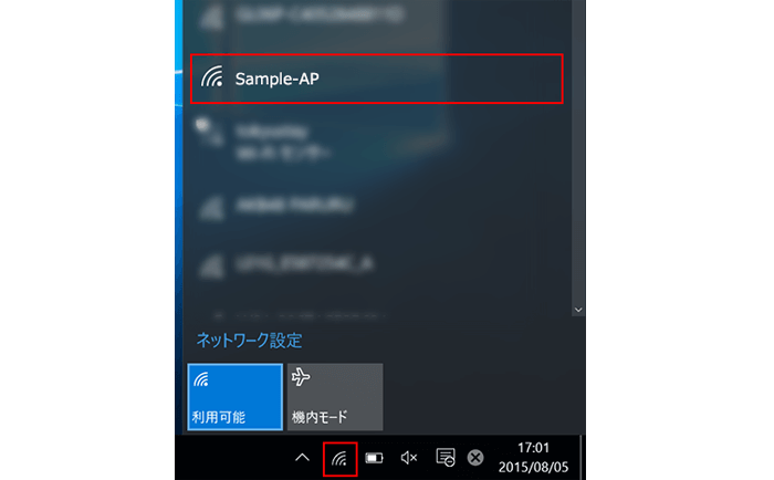 タスクバーにある無線 LAN のアイコンを選択し、表示されたネットワークの一覧から、利用する親機の [SSID] を選択します。