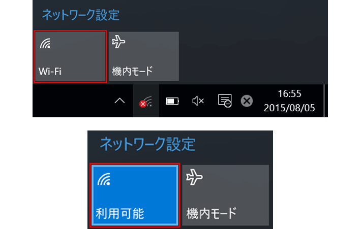 無線 LAN (Wi-Fi) がオンになると、パネルが青色になり「利用可能」と表示されます。